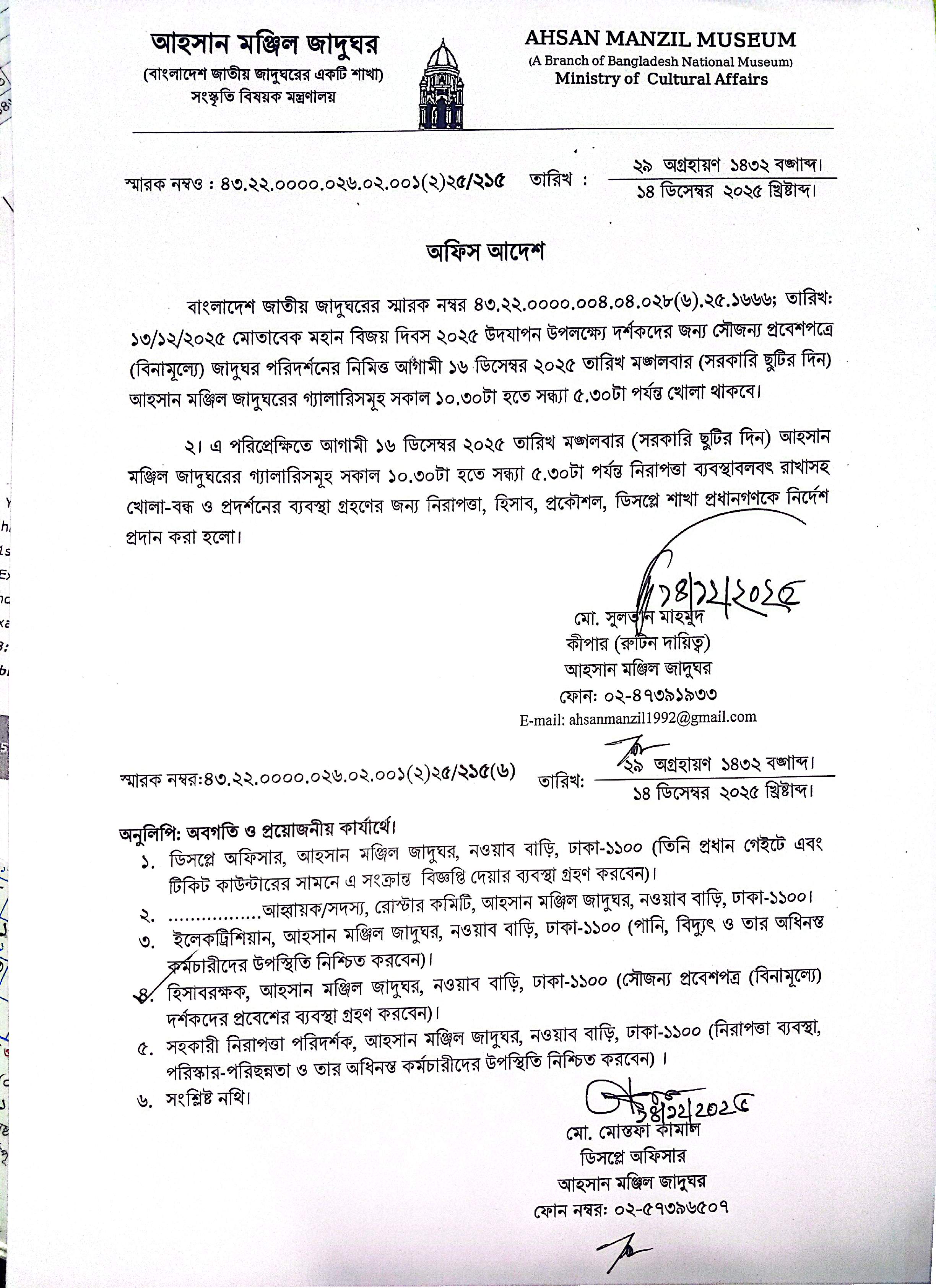 (1) ১৬ ডিসেম্বর ২০২৫ খ্রি. আহসান মঞ্জিল জাদুঘর খোলা সংক্রান্ত নোটিশ।