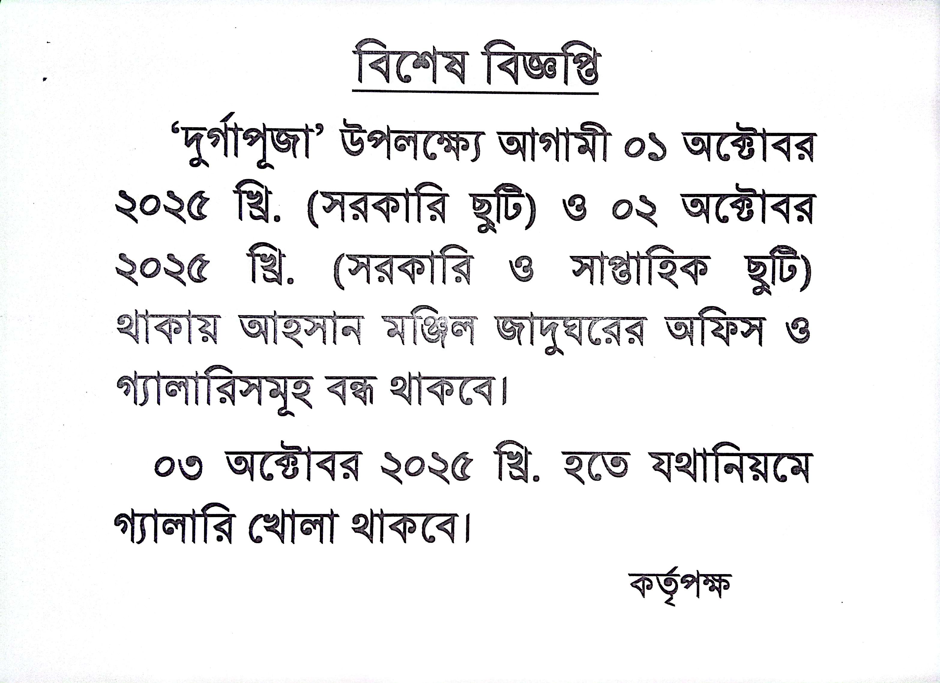 (1) বিশেষ বিজ্ঞপ্তি : ‘দুর্গাপূজা’ উপলক্ষ্যে আগামী ০১ অক্টোবর ২০২৫ খ্রি. (সরকারি ছুটি) ও ০২ অক্টোবর ২০২৫ খ্রি. (সরকারি ও সাপ্তাহিক ছুটি) থাকায় আহসান মঞ্জিল জাদুঘরের অফিস ও গ্যালারিসমূহ বন্ধ থাকবে। ০৩ অক্টোবর ২০২৫ খ্রি. হতে যথানিয়মে গ্যালারি খোলা থাকবে।