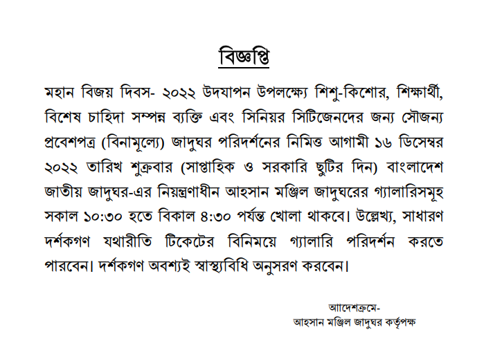 (62) মহান বিজয় দিবস ২০২২ উপলক্ষ্যে ১৬ ডিসেম্বর ২০২২ তারিখে আহসান মঞ্জিল জাদুঘরের গ্যালারি পরিদর্শনের বিজ্ঞপ্তি